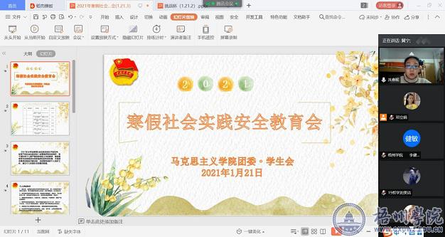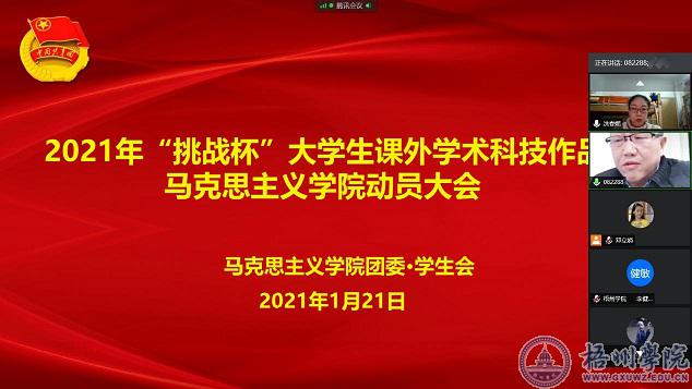 1月21日下午,马克思主义学院团委召开线上寒假社会实践安全教育会暨第十七届“挑战杯”动员大会。学院领导以及各实践项目团队的指导老师和全体成员参加,会议由团委书记冼春妮主持。