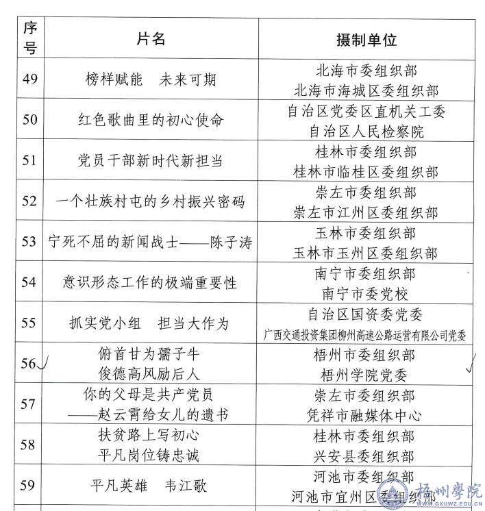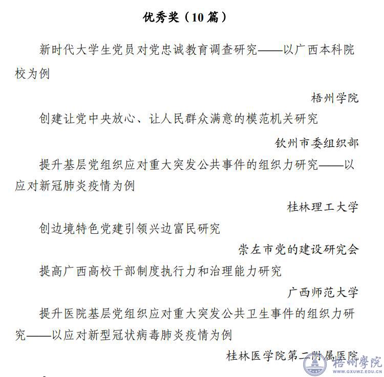 近日,由我校冀宁、廖壮欢、许丽娟、覃春丽、莫伍珠撰写的《新时代大学生党员对党忠诚教育调查研究——以广西本科院校为例》获广西党的建设研究会2020年度重点课题优秀奖,在30篇获奖课题中仅有4所高校的调研成果获得通报表扬。在全区2020年“党课开讲啦”暨党员教育“八桂先锋”优秀作品 (课件)评比中,我校推送的党课视频《俯首甘为孺子牛,俊德高风励后人》获优秀奖,本次共有200部优秀作品获得通报表扬,其中仅有3所高校作品入围。