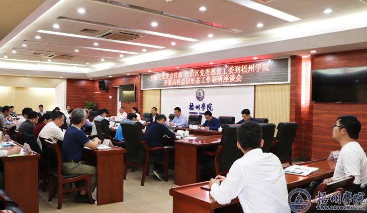 3月17日,自治区党委宣传部副部长、政府新闻办主任甘毅率调研组到我校就落实意识形态工作责任制情况进行调研。梧州市委常委、宣传部部长黄恩,自治区党委宣传部新闻协调小组组长周霖、自治区教育厅高等教育处副处长赵崇、梧州市二级巡视员刘红明等随行调研。