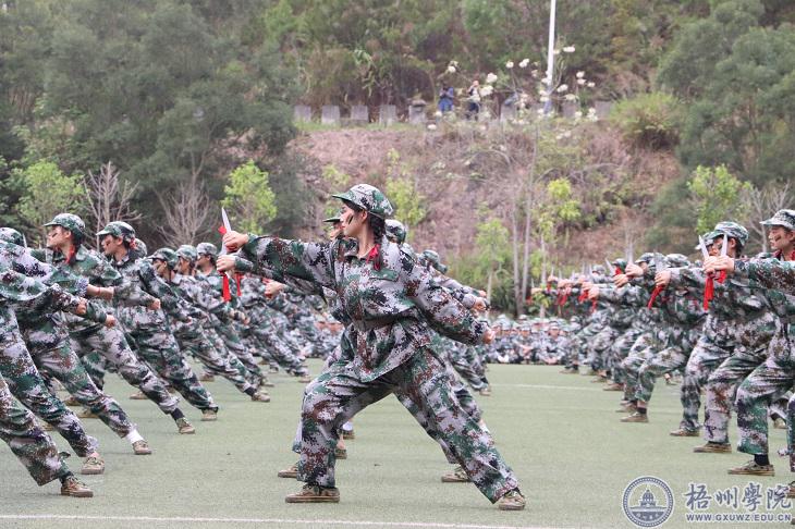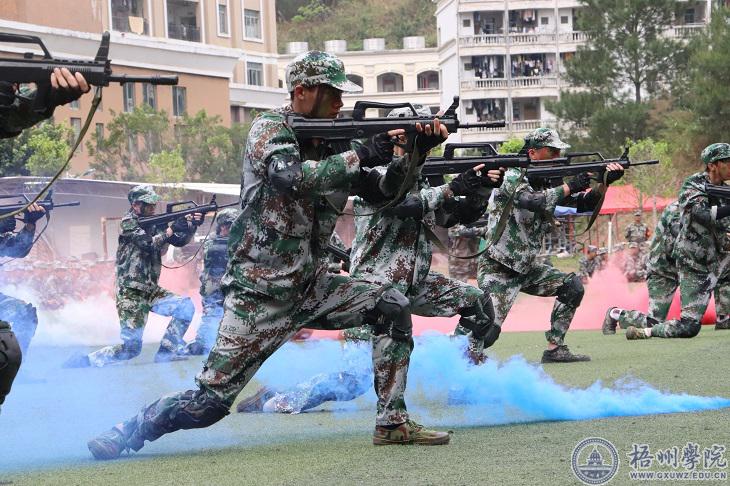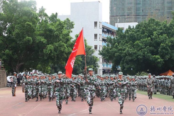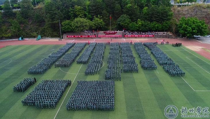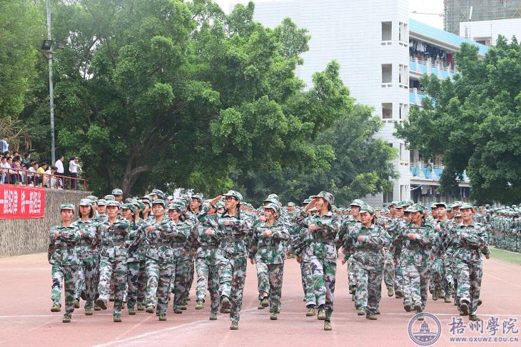 梧州军分区领导和学校领导检阅了新生军训团,随后新生军训团进行分列式表演。在分列式表演上,4个营46个连,他们统一身着军绿色迷彩服,步伐雄健,口号激越,队伍整齐,依次通过主席台接受检阅。