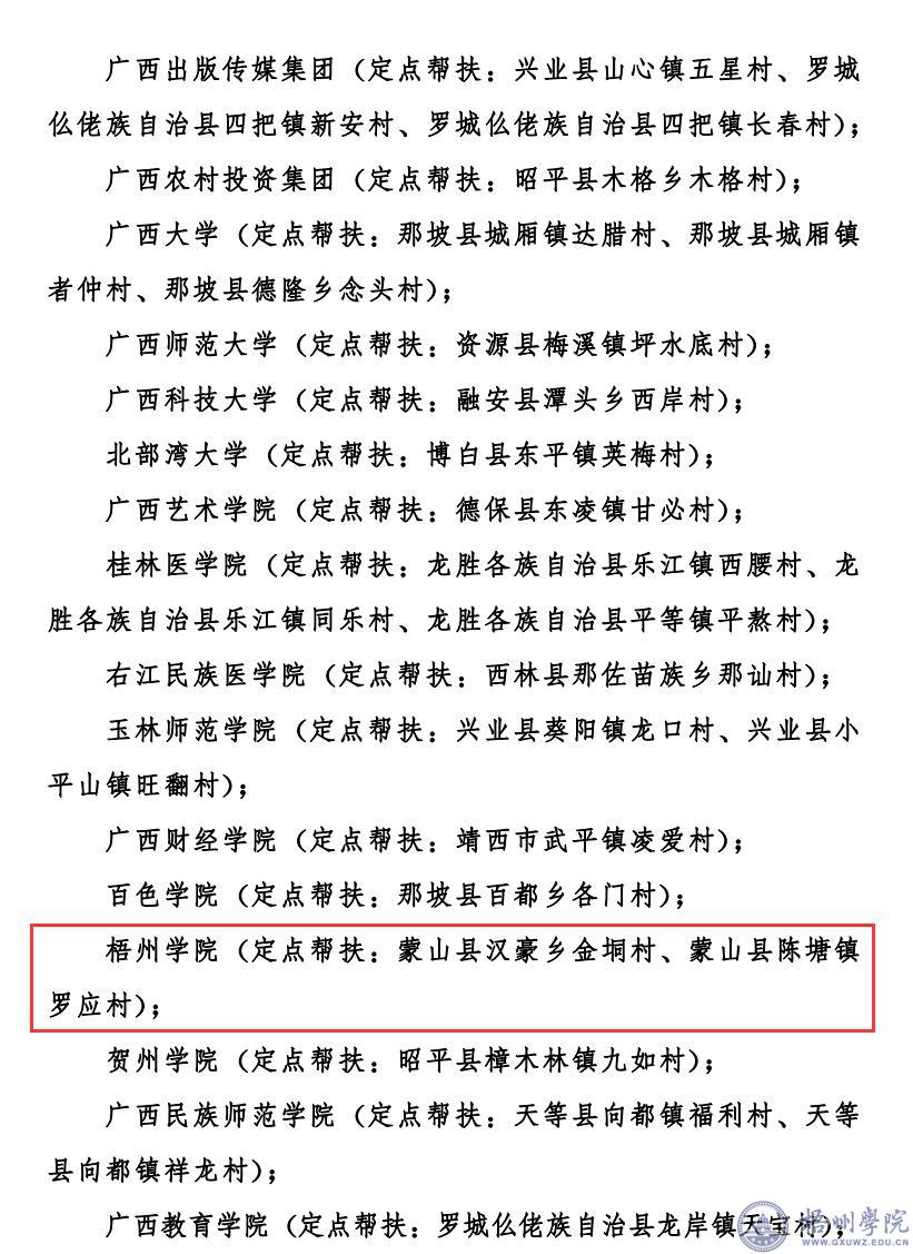 近日,自治区党委办公厅、自治区人民政府办公厅发文对全区2020年度脱贫摘帽有关单位进行通报表扬。我校作为2020年度脱贫摘帽村蒙山县汉豪乡金垌村、蒙山县陈塘镇罗应村的定点帮扶单位获得表扬,本次共有72个区直、中直驻桂单位获得通报表扬,其中包括27所高校。