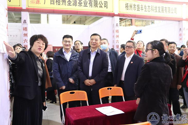 为进一步加强广西六堡茶产业科研人才小高地建设,搭建茶学等相关专业应届毕业生与茶企双向选择桥梁,充分发挥人才科技支撑作用,3月24日上午,广西六堡茶产业科研人才小高地揭牌仪式曁第一届“聚梧院企 纳吾英才”供需双选会分别在我校学术报告厅、体育馆举行。梧州市委副书记蒋海东,校长杨奔,校党委副书记曹迎,副校长宾月景,梧州市相关部门负责人出席活动。