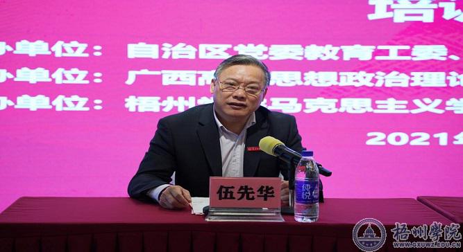 我校党委书记韦仕珍在致辞中指出,梧州作为千年古城,是中国共产党广西地方组织的发源地,是广西第一面党旗飘起的地方,是广西红色革命的摇篮,也是广西高等教育的发源地,蕴含了丰富的党史教育教学资源,她对全区高校马克思主义学院院长培训班在梧州举办表示热烈欢迎和祝贺。韦仕珍介绍了我校的发展历史和取得的育人成果:学校继承红色基因,依托学科人才的优势,设有“广西统一战线理论研究基地”、“桂东南马克思主义传播研究基地”等科研平台。韦仕珍希望各位学员以本次培训班为契机,加强与全区高校马克思主义学院(思政部)合作,在梧州学有所获、学有所悟、学有所成,共同推进红色革命精神在新时代传承弘扬。