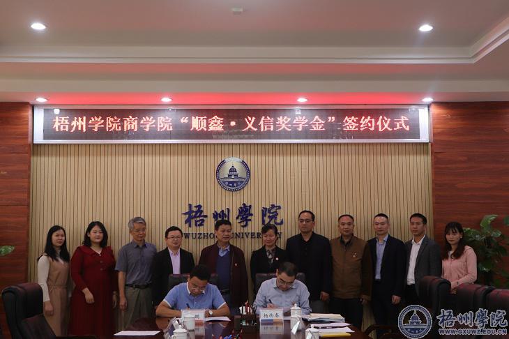 4月28日,梧州学院商学院“顺鑫·义信奖学金”签约仪式在明理楼八楼第二会议室举行。学校党委副书记曹迎出席签约仪式,梧州顺鑫网络科技有限公司、广西梧州义信建筑工程有限公司代表,我校学生工作部(处)、广西梧州学院教育发展基金会、商学院等部门领导、教师代表参加了签约仪式。