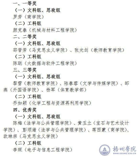 决赛评选出一等奖2名、二等奖3名、三等奖5名、优秀奖6名,同时授予“梧州学院青年教师教学能手”称号2名。我校将从文科组、工科组、思政组推荐第一名选手参加第八届全区高校青年教师教学竞赛。