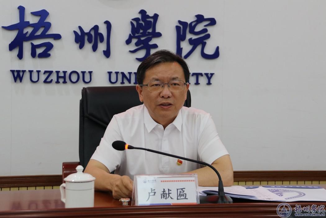 在听取学校有关发展情况汇报后,卢献匾对我校半年来取得的工作给予了肯定。他指出,我校东融有成果,希望下一步把成果深化为行动,融入广西、梧州的东融进程,争取成为东融标兵;学校“十四五”规划的各项目标振奋人心,但要注意不要关门搞规划,不应该是自弹自唱的规划,应是自治区、梧州市共同认可的、共同支持的、有可操作性的规划;思政课坚持教书育人核心,着力提升思政课水平、实现思政课的目标,久久为功、坚持不懈抓好思政课。