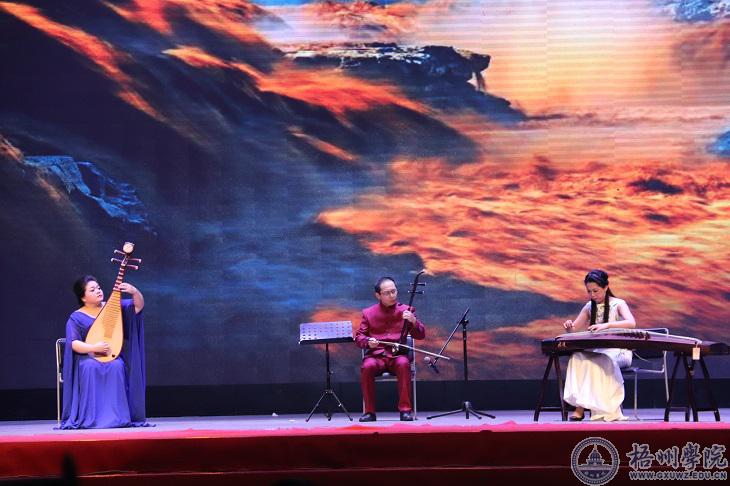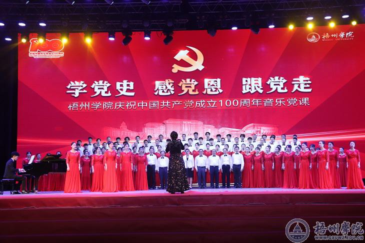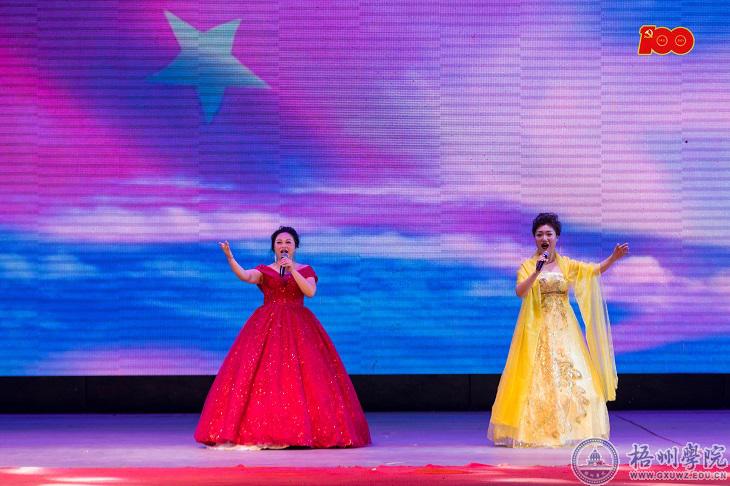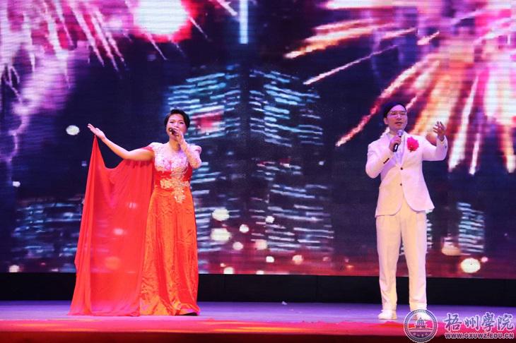 教职工合唱团男女声用一首《革命人永远是年轻》唱出革命人怀抱理想、不断创新、不断前进的激情,激发在场观众发奋图强的斗志。马纳、陈晓莉、陈洁老师共同带来的《春天的故事》《在希望的田野上》《中国永远收获着希望》表达师生对党、对祖国深深的感谢。韦思宇、蓝筱琰老师重唱的《灯火里的中国》,表达对祖国前景的美好祝愿。梧州学院知名校友谭媛媛为师生带来王广国的原创作品《感谢有你》。