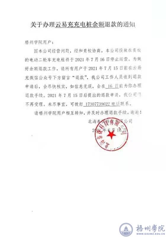 北海泰捷科技有限公司在学校经营的云易充充电桩,经与学校协商,决定将投放在学校(第一教学楼后面车棚5台,A9宿舍车棚1台、A10宿舍车棚2台,招待所车棚1台)的电动二轮车充电桩于2021年7月16日停止运营。在云易充微信平台还有充值余额的师生员工,请在2021年7月15日前及时办理余额退款。具体退款流程详见北海泰捷科技有限公司发布的《关于办理云易充充电桩余额退款的通知》,以及云易充微信平台发布的消息提醒。
