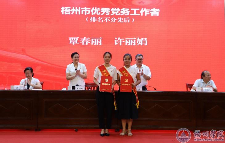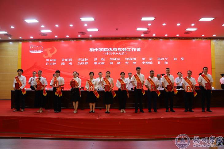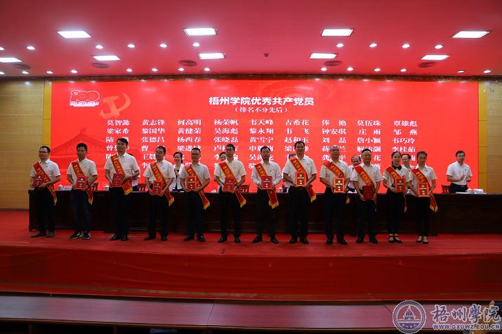 会上,校长杨奔宣读了《中共梧州学院委员会关于表彰梧州学院优秀共产党员、优秀党务工作者和先进基层党组织的决定》和《中共梧州学院委员会关于表扬2020年“学习强国”学习平台先进集体和先进个人的通知》。会上表彰了自治区优秀共产党员莫智懿;表彰了梧州市优秀共产党员黄志锋、何高明,梧州市优秀党务工作者覃春丽、许丽娟,梧州市先进基层党组织马克思主义学院教师党支部、电子与信息工程学院教师党支部;表彰了学校优秀共产党员杨荣帆等53人,学校优秀党务工作者李远林等17人,学校先进基层党组织宝石与艺术设计学院学生第一党支部等8个;表彰了“学习强国”平台学习标兵梁复明等20人,学习先进个人肖雅予等118人,先进集体机关党委、大数据与软件工程学院党委、文学与传媒学院党委。