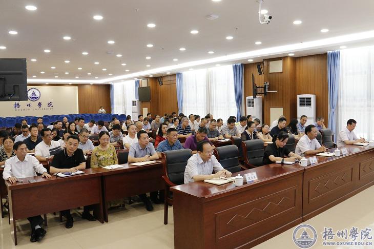 为更好地总结春季学期工作,7月14日上午,学校在明科楼一楼多功能报告厅召开2021年春季学期工作总结会。学校领导韦仕珍、杨奔、曹迎、邱房贵、梁业华、麻新纯出席会议,学校全体中层干部参加会议。会议由校党委书记韦仕珍主持。