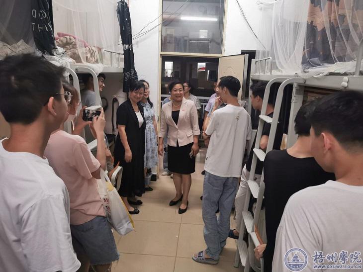 8月31日晚上,学校党委书记韦仕珍在校党委副书记曹迎,学工部(处)长、校团委相关负责人陪同下,深入班会课堂和宿舍走访调研学生开学返校情况。