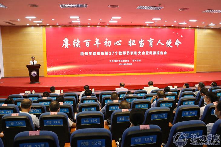9月10下午,在第37个教师节到来之时,为大力宣传学习优秀教师和优秀教育工作者的先进事迹,弘扬新时代尊师风尚,展现人民教师精神风貌,学校在明理楼学术报告厅举办主题为“赓续百年初心 担当育人使命”庆祝第37个教师节表彰大会暨师德报告会,教职工欢聚一堂,共庆节日。学校领导韦仕珍、杨奔、曹迎、玉振明、邱房贵、梁业华、麻新纯、宾月景出席表彰会。会议由学校党委副书记曹迎主持。