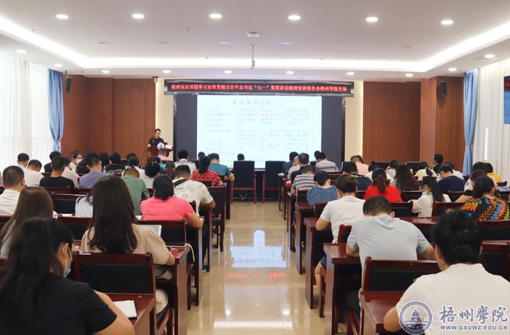 | 9月8日下午,梧州市宣讲团学习宣传贯彻习近平总书记“七一”重要讲话精神宣讲报告会梧州学院专场在我校明科楼一楼报告厅召开。梧州市宣讲团成员、我校毛泽东思想和中国特色社会主义理论体系概论课程教研室主任、副教授陈云健作题为《学习“七一”讲话:由话思史,明史爱党》的宣讲报告。各职能部门、教辅单位及二级学院教师代表110多人参加本次宣讲会。