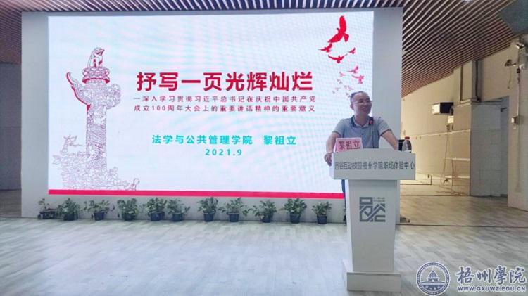 为学习贯彻习近平总书记“七一”重要讲话精神,引导广大党员、干部、群众深刻领会和把握讲话的重大意义,切实把思想和行动统一到讲话精神上来的要求, 9月16日下午,法学与公共管理学院党总支在体育馆邑谷空间,组织“深入学习习近平总书记在庆祝中国共产党成立100周年大会上的重要讲话精神的重要意义”的专题宣讲,法管学院党总支书记黎祖立作专题辅导,法管学院学生党员、党建中心干部及2021级新生参加了学习。