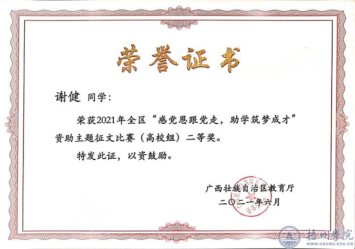 在2021年全区高校资助主题征文、书法、演讲比赛中,我校学生参赛征文分别获得一个二等奖、一个优秀奖,书法作品获两个三等奖,演讲比赛获优秀奖。