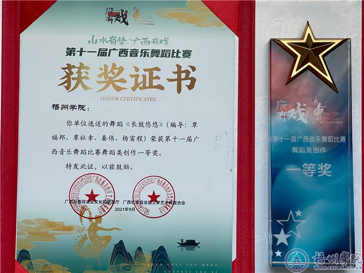 9月25日晚,由广西壮族自治区文化和旅游厅、广西壮族自治区文学艺术界联合会主办,柳州市文化广电和旅游局承办的第十一届广西音乐舞蹈比赛在柳州市艺术剧院落下帷幕。我校报送的舞蹈作品《长鼓悠悠》在68个参赛作品中脱颖而出,喜获创作一等奖,充分展示了我校美育教学成果。