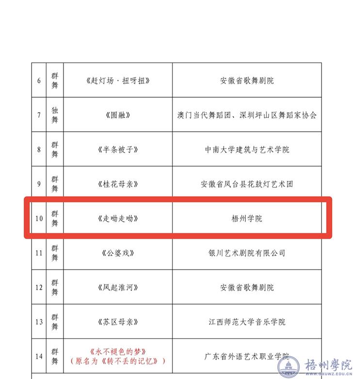 群舞《走呦走呦》为国家艺术基金2019年度小型剧(节)目和作品资助项目,曾获全国第五届大学生艺术展演活动一等奖和优秀创作奖。该作品以壮族传统板鞋舞为元素,创新了舞蹈道具的使用,以走板鞋的动律创新发展了舞蹈动作,以“走”的视角,讲述了壮族老阿妈向女儿传承板鞋舞技艺,与大家团结一致向前走的情节,讴歌广西各族人民团结和谐的精神,激励各族人民奋力建设壮美广西,共圆复兴梦想。