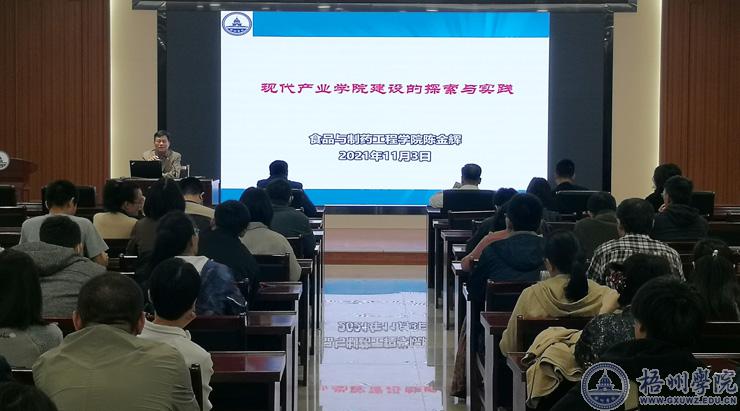 分享会上,食品与制药工程学院党委书记陈金辉以《现代产业学院建设的探索与实践》为题作专题研修报告,分享了个人参加现代产业学院建设(第一期)高级研修班的心得体会,阐述了“‘四新’教育改革与现代产业学院建设”“现代产业学院建设申报交流”“现代产业学院申报的逻辑与实践”等相关现代产业学院建设探索的共同点、建设模式、培养模式等情况。并从二级学院角度分析目前和今后学院现代产业学院的建设方向。