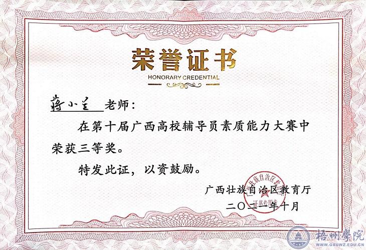 10月20日至22日,第十届广西高校辅导员素质能力大赛在广西师范大学育才校区举行。经过基础知识测试、谈心谈话、案例研讨三个环节的比赛,我校辅导员蒋小兰老师沉着应战,展示出扎实的专业技能和良好的综合素质,荣获比赛三等奖。