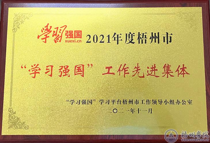 | 11月4日,2021年梧州市“学习强国”学习平台业务培训暨“学习强国”工作先进集体颁奖活动在市图书馆多功能报告厅举办,对10个梧州市直属机关工委直管党组织、10个梧州市“学习强国”二级管理组织进行颁奖表扬。我校荣获“学习强国”工作先进集体称号。