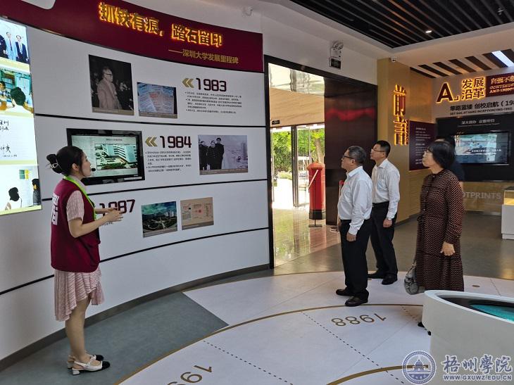 11月4日上午,调研组一行来到深圳大学粤海校区,参观了深圳大学校史馆,重点了解深圳大学学科建设成就与特色。在座谈会上,杨奔校长说明了此行的目的并简要介绍了梧州学院的情况,提出希望深圳大学支持的需求。李美清处长提出深化两广高等教育协作思路建议,双方围绕专业带头人培养、在线课程共建共享、硕士学位点建设等内容进行了深入交流。深圳大学方面做了积极热情和富有建设性的回应。