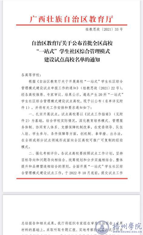 近日,自治区教育厅发布了《自治区教育厅关于公布首批全区高校“一站式”学生社区综合管理模式建设试点高校名单的通知》(桂教思政〔2021〕33号),经各高校推荐、专家审议、结果公示,我校入选首批全区高校“一站式”学生社区综合管理模式建设试点高校。