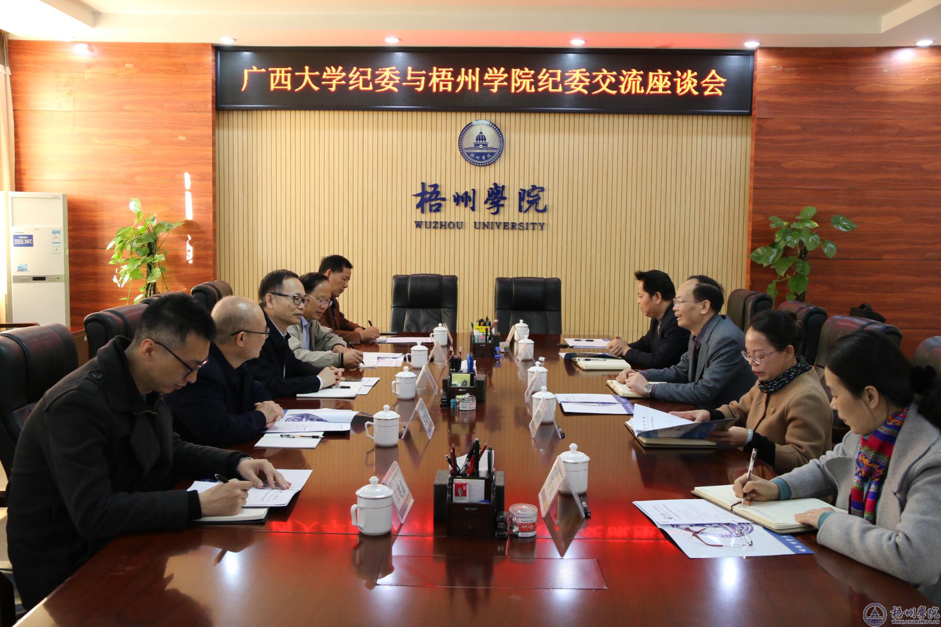 12月1日下午,广西大学党委常委、纪委书记吕逸一行来我校考察交流。学校党委书记韦仕珍、纪委书记梁业华在明理楼八楼第二会议室会见吕逸一行。