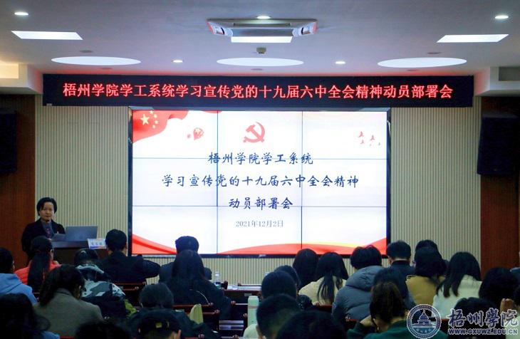 12月2日晚,学工系统学习宣传党的十九届六中全会精神动员部署会在明理楼七楼视频会议室召开,校党委副书记曹迎出席会议,学生工作部(处)、校团委全体干部,各二级学院分管学生工作领导,全体辅导员参加本次会议。
