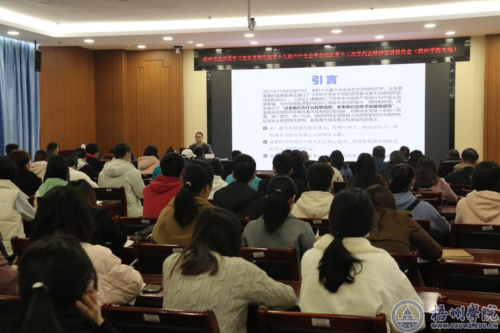 | 12月23日,梧州市宣讲团到我校举行学习贯彻党的十九届六中全会精神宣讲报告会。梧州市宣讲团成员、市委党校副校长田新元副教授在明科楼一楼报告厅为我校机关教职工、各二级学院师生代表100多人作题为《党的十九届六中全会精神解读》宣讲报告。