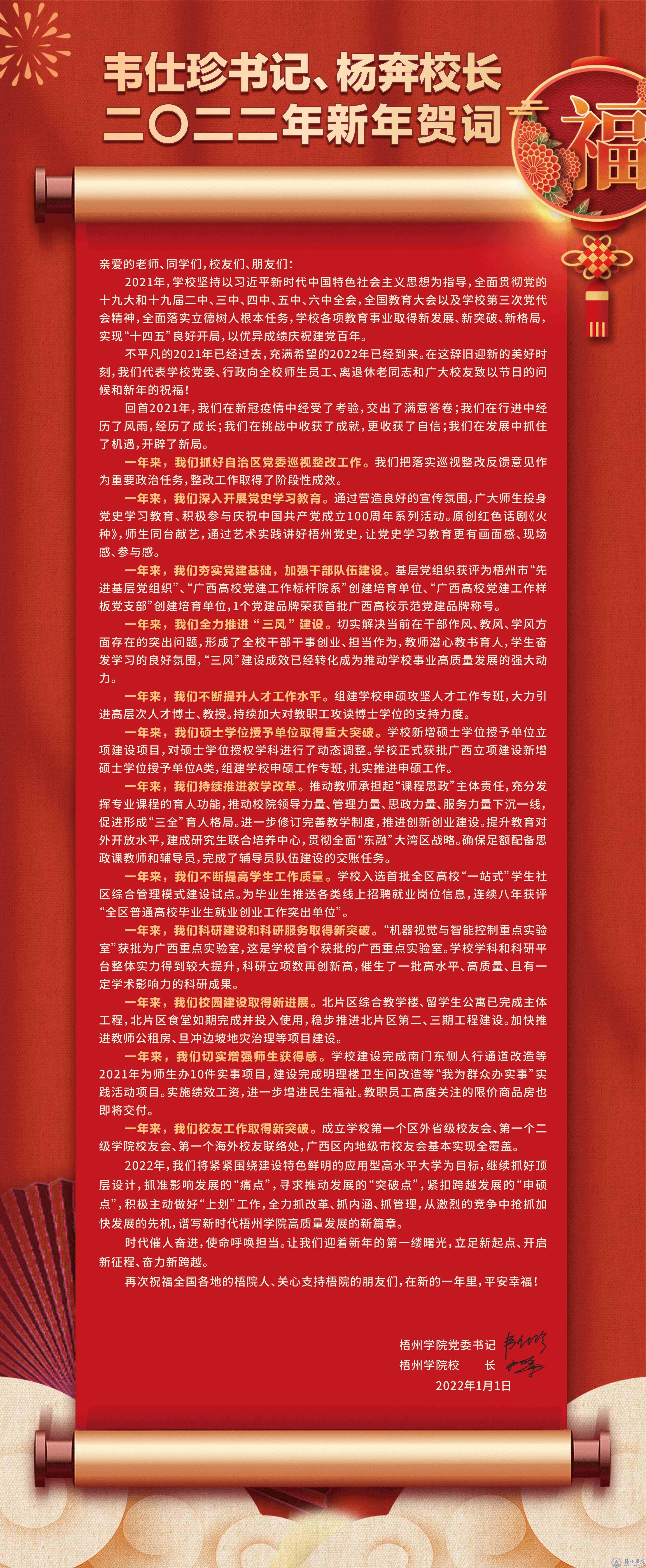 书记韦仕珍、校长杨奔二〇二二年新年贺词