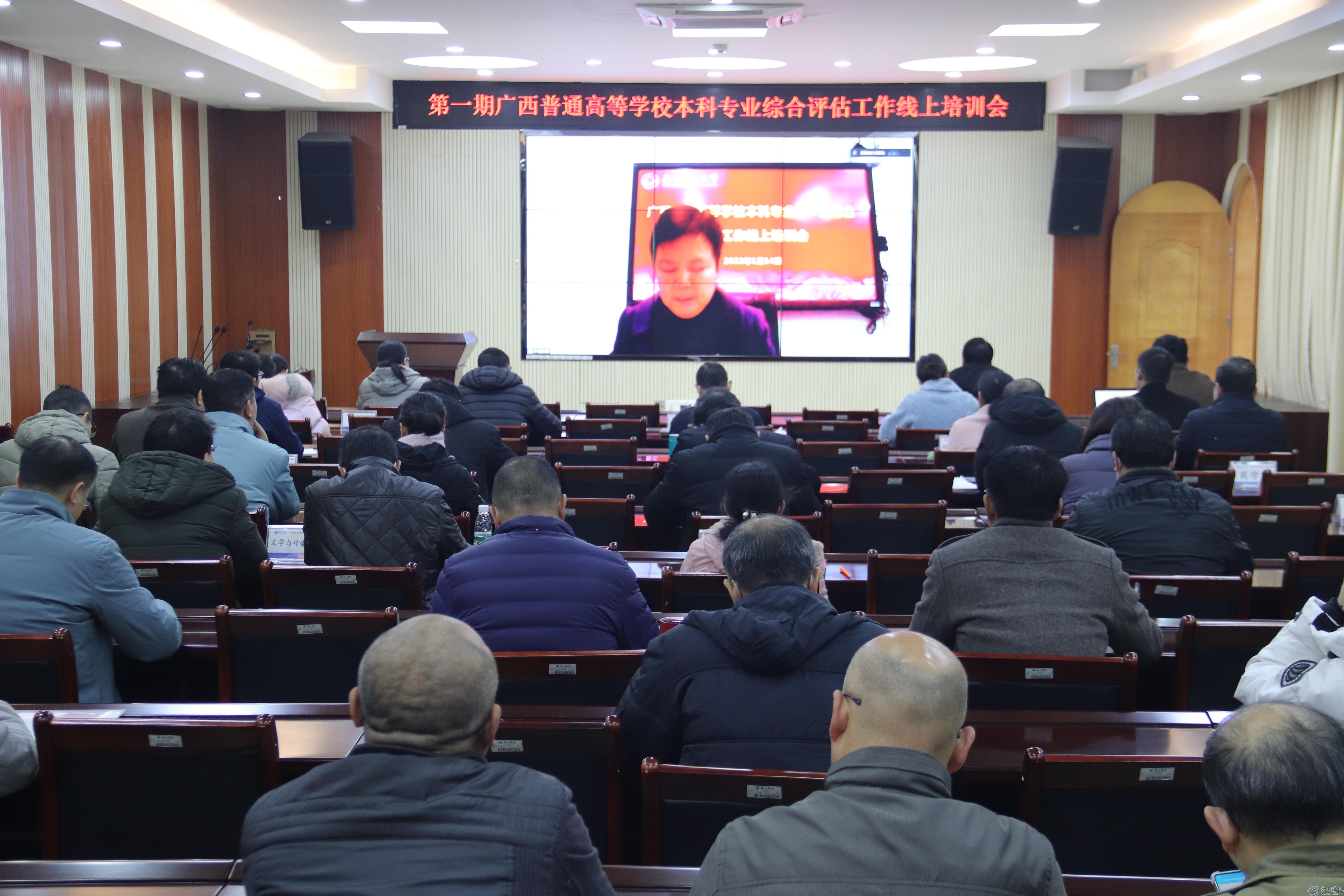 1月14日上午,自治区教育厅举办了第一期广西普通高校本科专业综合评估工作线上培训会。学校组织各相关单位各部门负责人,各专业负责人及联络员,教务处科级以上人员等70余人在明理楼七楼视频会议室参加了线上培训会。