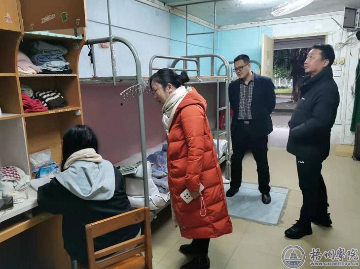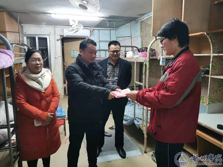 1月17日下午,学生工作(部)处(部)处长李德华一行来到寒假留校学生集中住宿区,看望慰问受疫情影响无法回家的学生,详细了解了他们学习生活情况,叮嘱他们注意安全,有困难及时向学校反映,随时与家长、老师保持密切联系。同学们对学校的关心表达了感谢,并表示一定积极配合学校安排,遵守疫情防控相关规定。