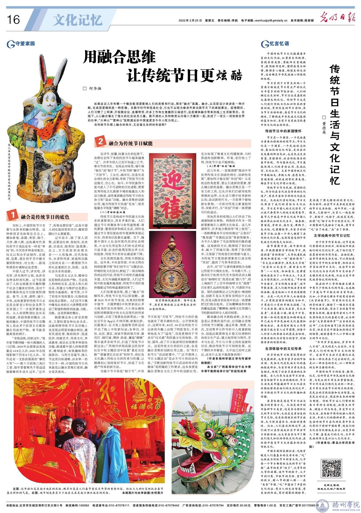 2月25日,我校文学与传媒学院何华湘教授在《光明日报》(2022年02月25日“文化记忆”版)发表题为《用融合思维让传统节日更炫酷》一文。文章揭示了融合是传统节日的底色,论述了应用融合思维为传统节日赋能,通过具象、情景、仪式、互动等多元符号的引入或重新组合,创造出既看得见乡愁又玩得转时尚的文化产品,建立起传统与现代、艺术与生活、节日与日常之间的连接和对话,推动传统节日可持续发展。