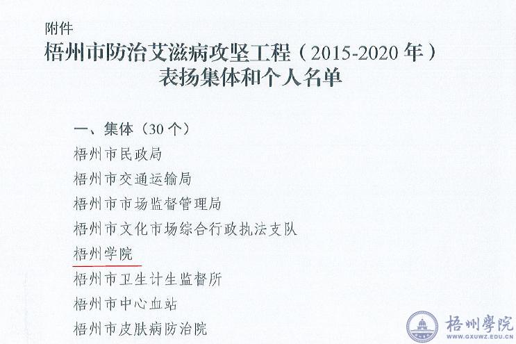 近日,根据《梧州市防治艾滋病工作委员会关于表扬梧州市防治艾滋病攻坚工程(2015-2020年)突出成绩集体和个人的决定》(梧防艾委〔2022〕1号),我校获梧州市防治艾滋病攻坚工程(2015-2020年)表扬集体称号。