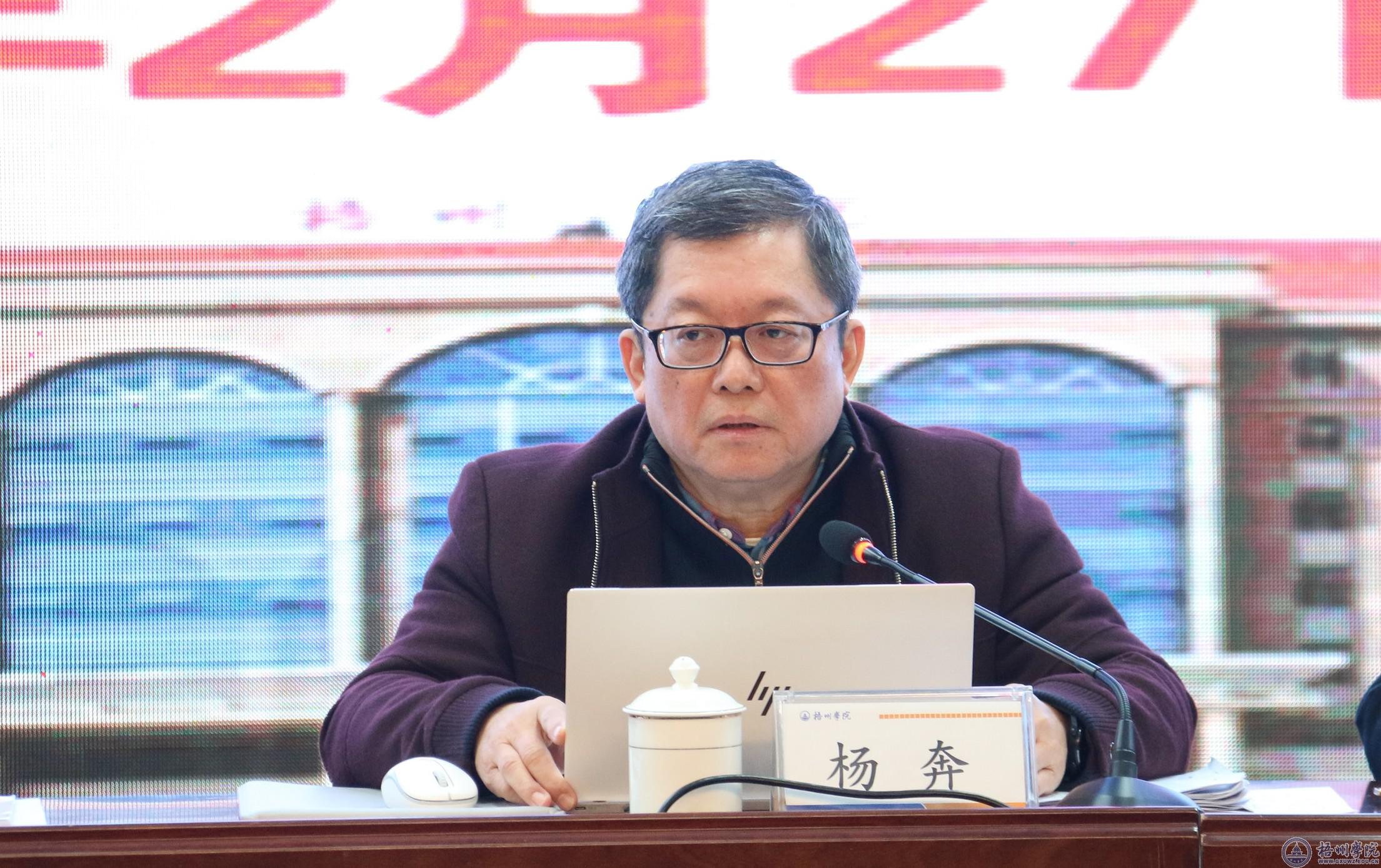 校长杨奔以《踔厉奋发,笃行不怠,奋力打赢“申硕攻坚战”》为题作工作布置讲话。他通过传达、领学全区省级领导和厅级主要负责同志学习贯彻党的十九届六中全会精神暨自治区第十二次党代会精神专题研讨班精神、教育部2022年工作要点、全区教育工作会议精神、2022年全国高教处长会议精神,说明“提高政治站位”的重要性。他提出,学校2022年的中心工作是申硕,2022年是学校的“申硕攻坚年”,全校上下必须统一思想,提高认识,增强“申硕攻坚”的责任感和使命感。就如何奋力打赢申硕攻坚战,他要求全校上下狠抓工作计划的落实和执行:在师资队伍建设和人才引进工作中踔厉奋发立潮头、笃行不怠争上游,展现我们的新作为;在科研工作中踔厉奋发立潮头、笃行不怠争上游,迈开我们的新步伐;在教学改革上踔厉奋发立潮头、笃行不怠争上游,闯出我们的新路子。