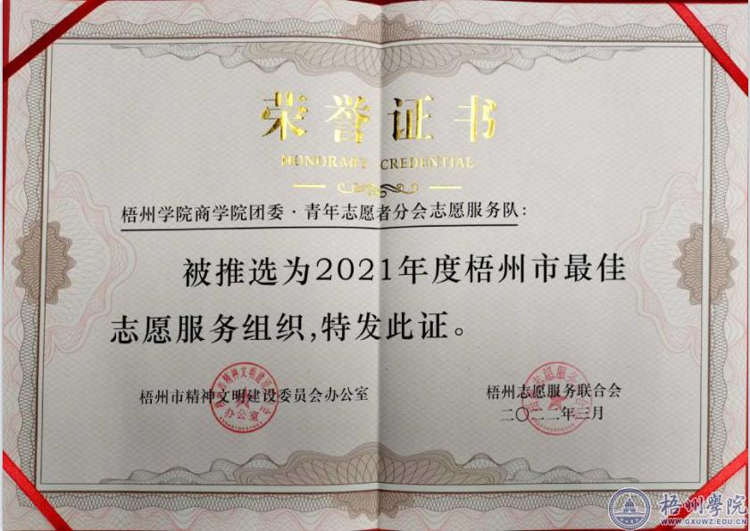 近日,根据《关于表扬2021年度梧州市学雷锋志愿服务先进典型的通报》(梧文明办〔2022〕5号),我校商学院团委·青年志愿者分会服务队被评为年度最佳志愿服务组织,白杨微公益协会“点亮心灯,与爱同行——走进星星孩子的世界”志愿服务项目被评为年度最佳志愿服务项目。