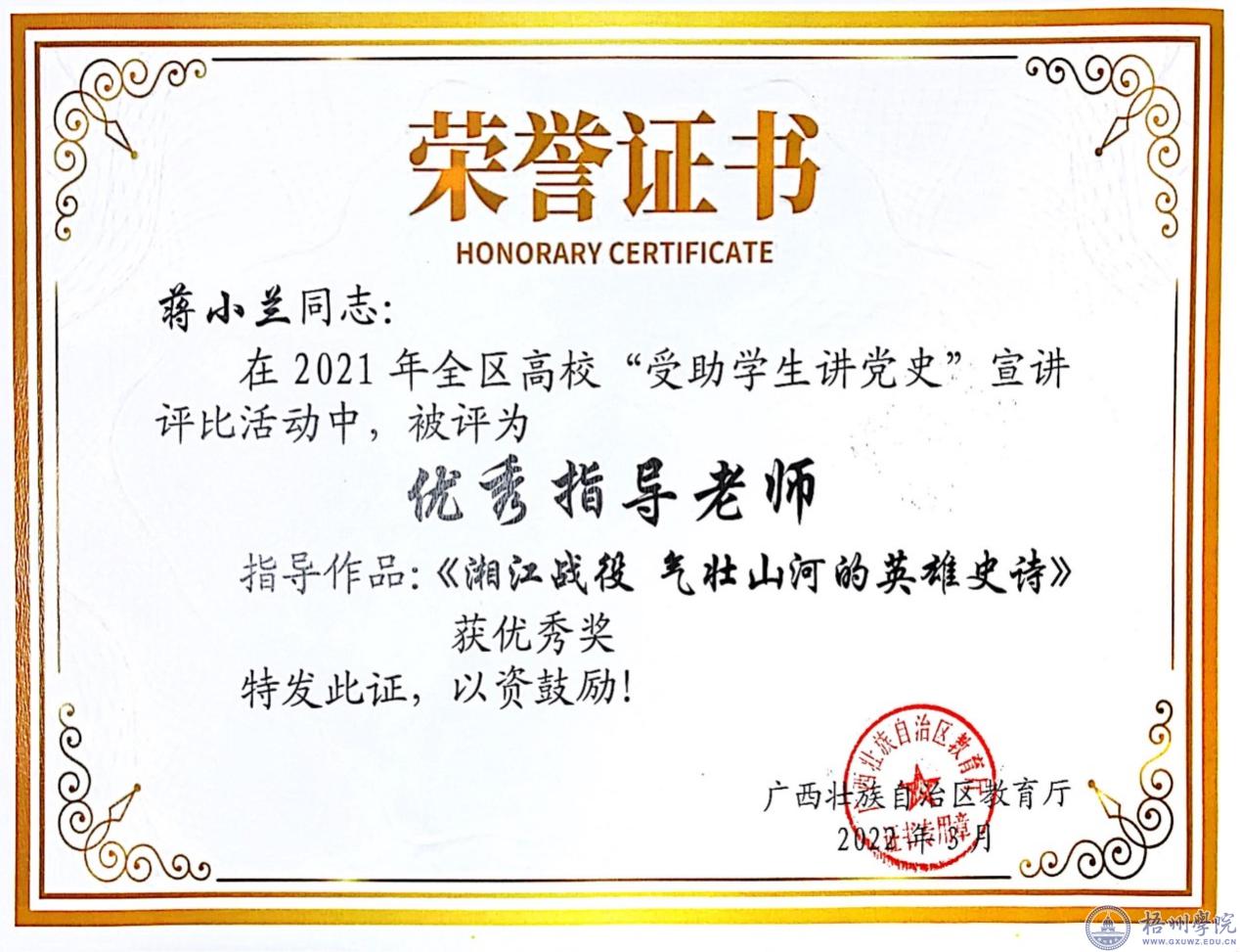在2021年全区高校“受助学生讲党史”宣讲评比活动中,我校机械与资源工程学院2019级资源循环科学与工程班唐能婷同学凭借作品《湘江战役 气壮山河的英雄史诗》荣获优秀奖,蒋小兰、德吉央宗两位老师被评为优秀指导老师。
