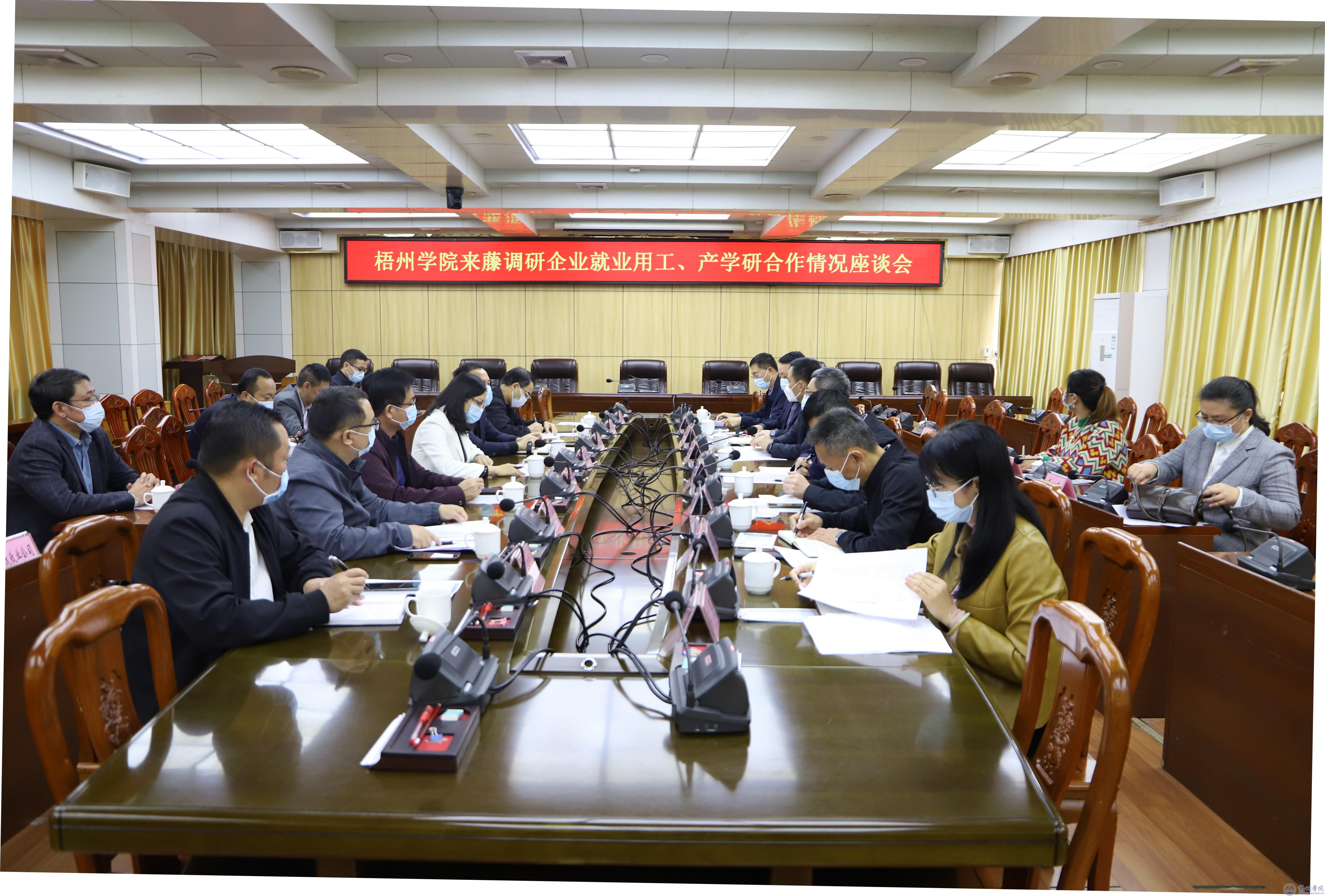 调研组与相关单位、企业进行座谈。梁小霞介绍了藤县企业就业用工、产学研合作情况。她希望能与学校建立常态化合作机制,深入探索校企合作育人模式,将学校的“教”与企业的“产”真正融合起来,校企双方形成合力,实现共赢。调研组成员、藤县相关部门和企业负责人围绕高校毕业生就业优惠政策、校企双方用工需求对接、大学生实习实训基地建设等方面展开深入交流,就校企合作人才培养、选派学校高层次人才担任企业科技特派员、提升校企供需对接和科研成果转化成效等方面进行探讨。