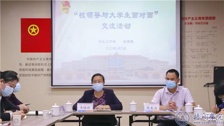 5月5日晚,学校在体育馆一楼青马书屋举办“校领导与大学生面对面”交流活动。学校党委书记韦仕珍,副校长范生汝,学生工作部(处)、校团委主要负责人,校、院两级团学组织20多名学生干部代表参加了交流活动。