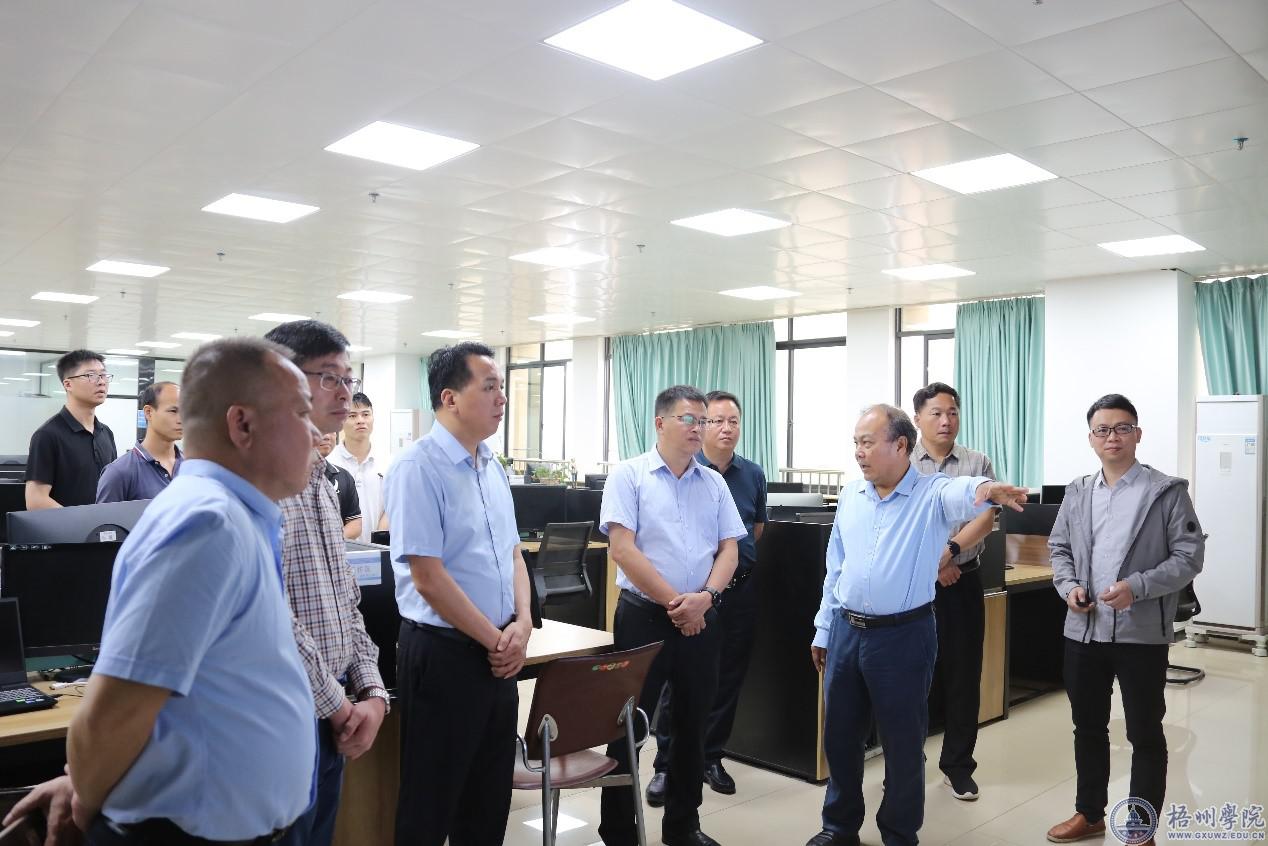 黄展平一行先后考察了创新创业学院、广西机器视觉与智能控制重点实验室、广西智能显微设备工程技术研究中心、软件开发中心、机电控制与快速形成重点实验室培育基地、机器人实验室、现代教育技术中心,听取相关负责人在实验室建设、研究方向、特色优势、科研成果、网络安全等方面的介绍。黄展平、陈文强等人对学校的科研能力和实验建设情况给予肯定,并指出网络安全是一场无硝烟的战争,关系政治安全、国家安全,在无硝烟的战争中不能有丝毫懈怠、放松心理。