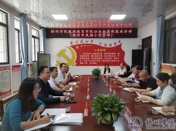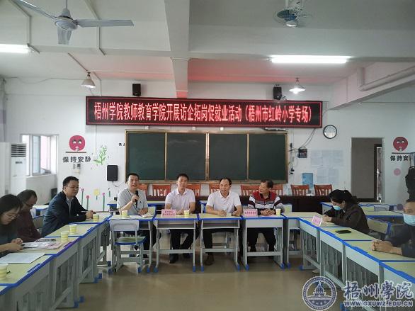5月17日下午,教师教育学院班子成员、毕业班辅导员一行6人到梧州市凤翔小学、红岭小学开展访企拓岗活动,梧州市长洲区教育局局长谢松及两所小学校长参加调研活动。