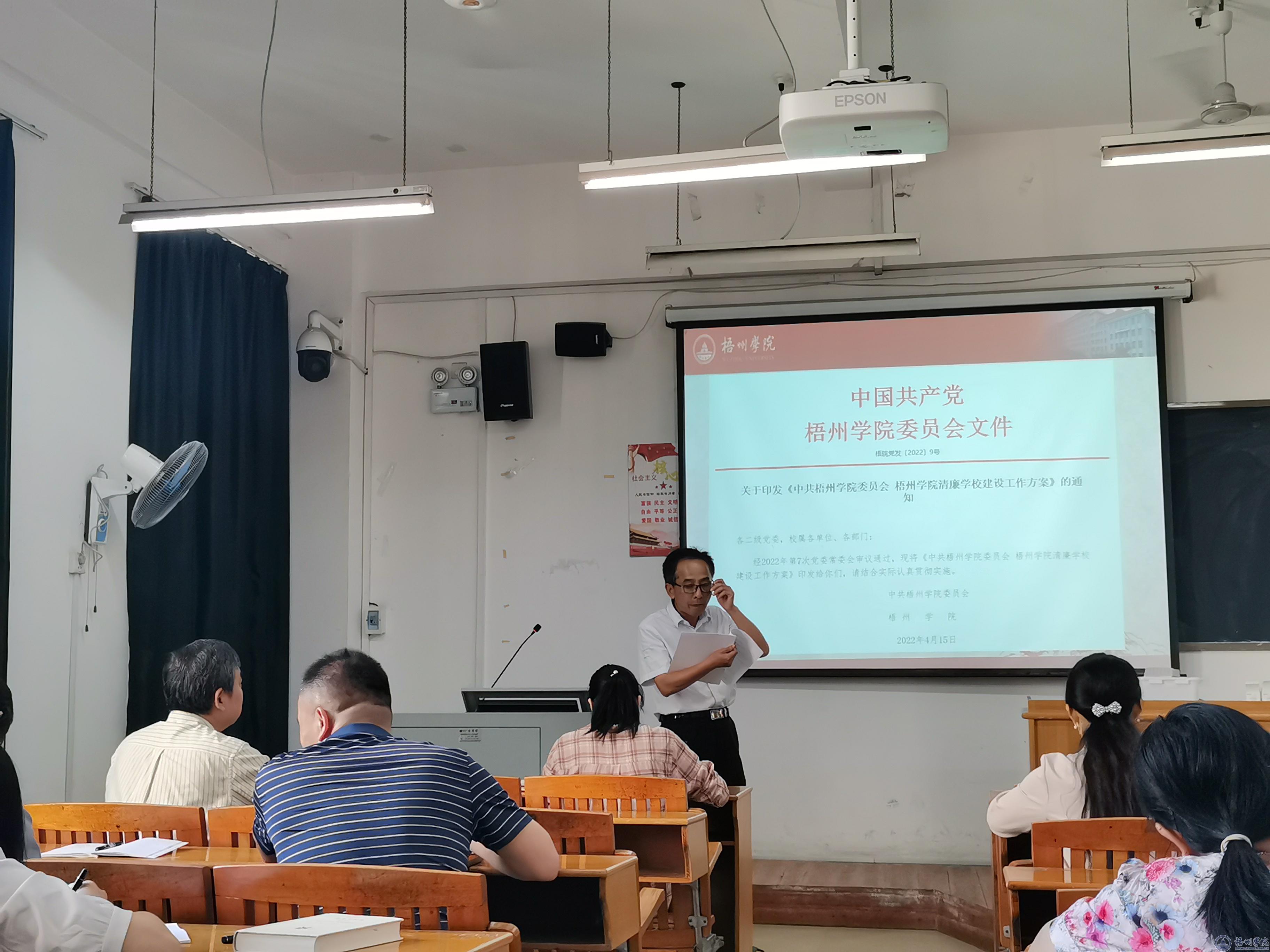 学院党委书记张朝松同志领学了《中共梧州学院委员会梧州学院清廉学校建设工作方案》,党委副书记罗吉娟同志要求全体教师要坚持严谨治学,谨慎为人,自觉培养清廉意识、清廉习惯、清廉作风。随后,全体思政课专兼职教师观看廉洁教育专题片。