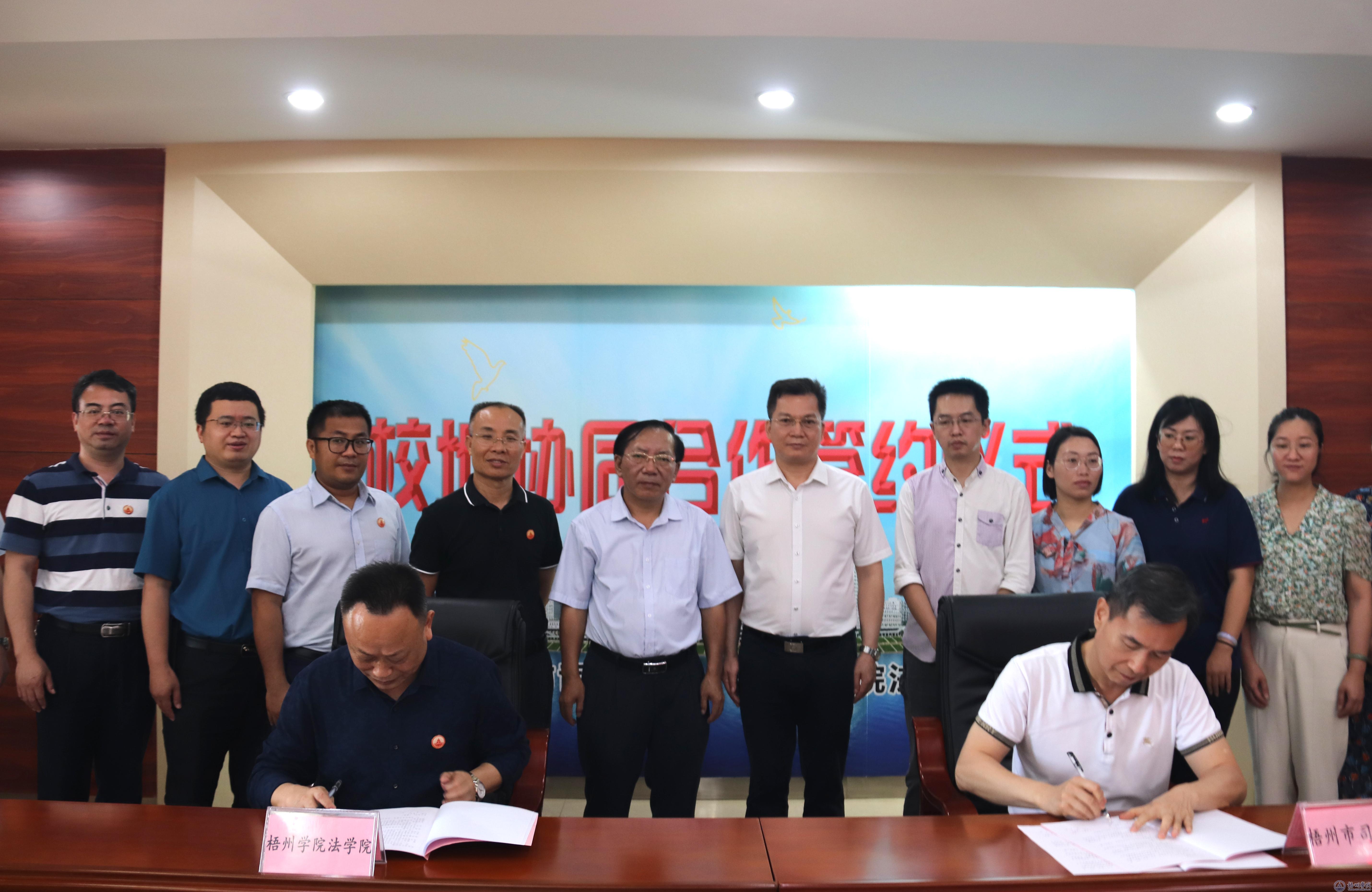 5月25日下午,法学院与梧州市司法局在学校明理楼八楼第一会议室签订校地协同合作协议。学校副校长邱房贵出席活动,梧州市司法局党组书记、局长梁达斌、党组成员副局长李龙一行10人,法学院领导班子成员及师生代表参加活动。