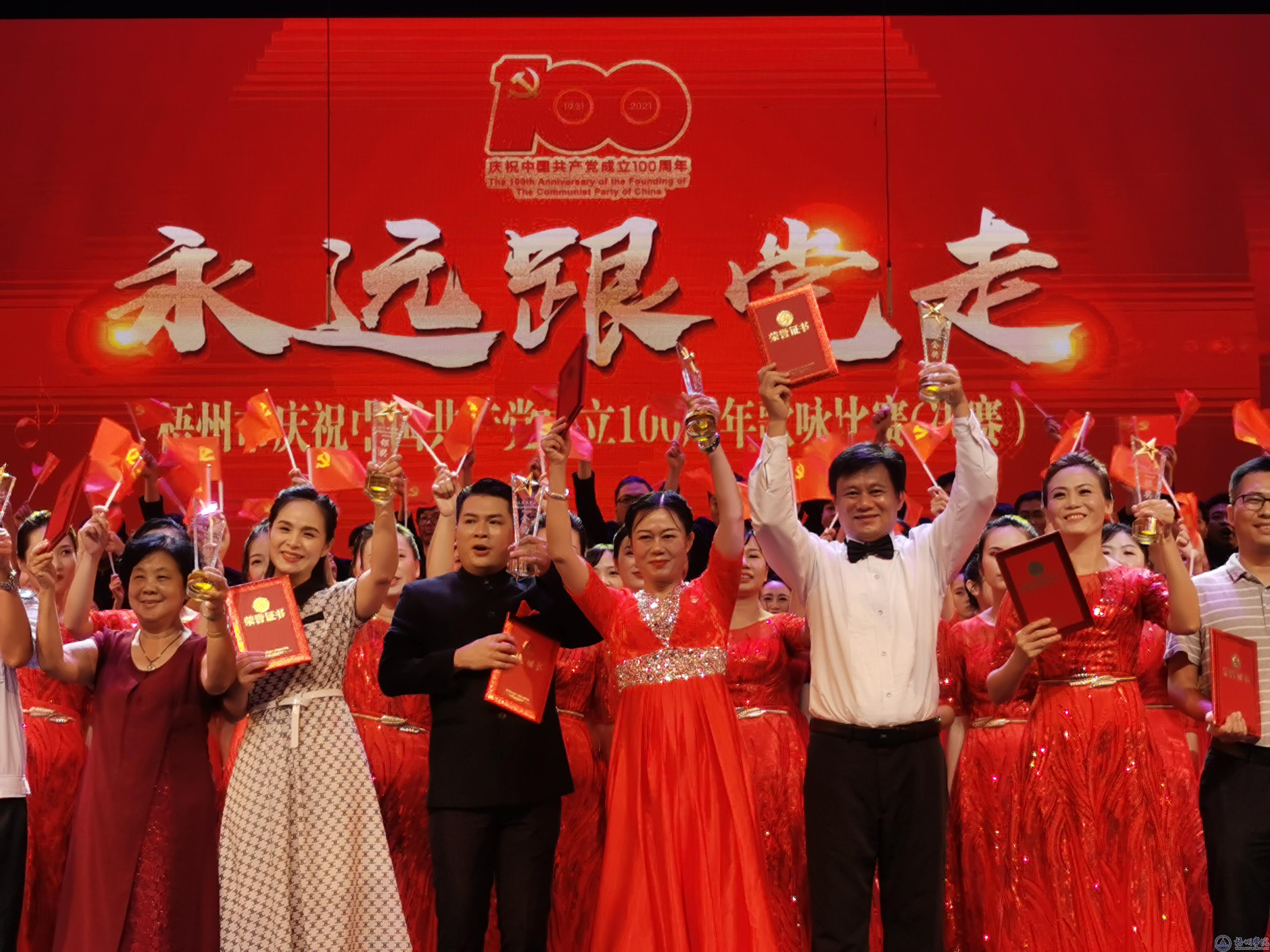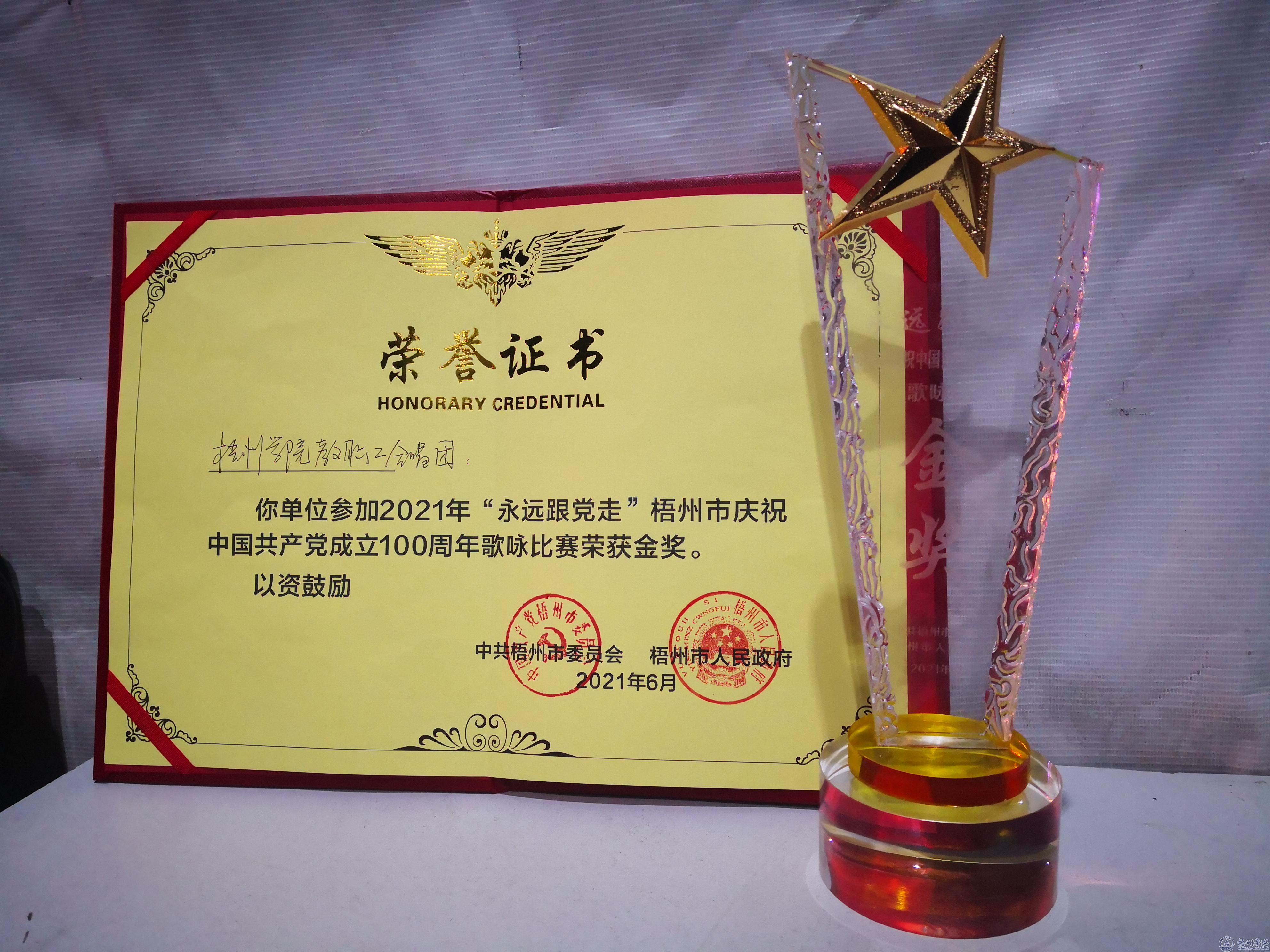 结果不与时间划等量,业余团队追逐专业水准。去年合唱团第一次参赛就首战告捷,在六月份参加的梧州市庆祝中国共产党成立100周年歌咏比赛中,合唱团演唱的《不忘初心》和《阳光路上》两首歌曲获得金奖。