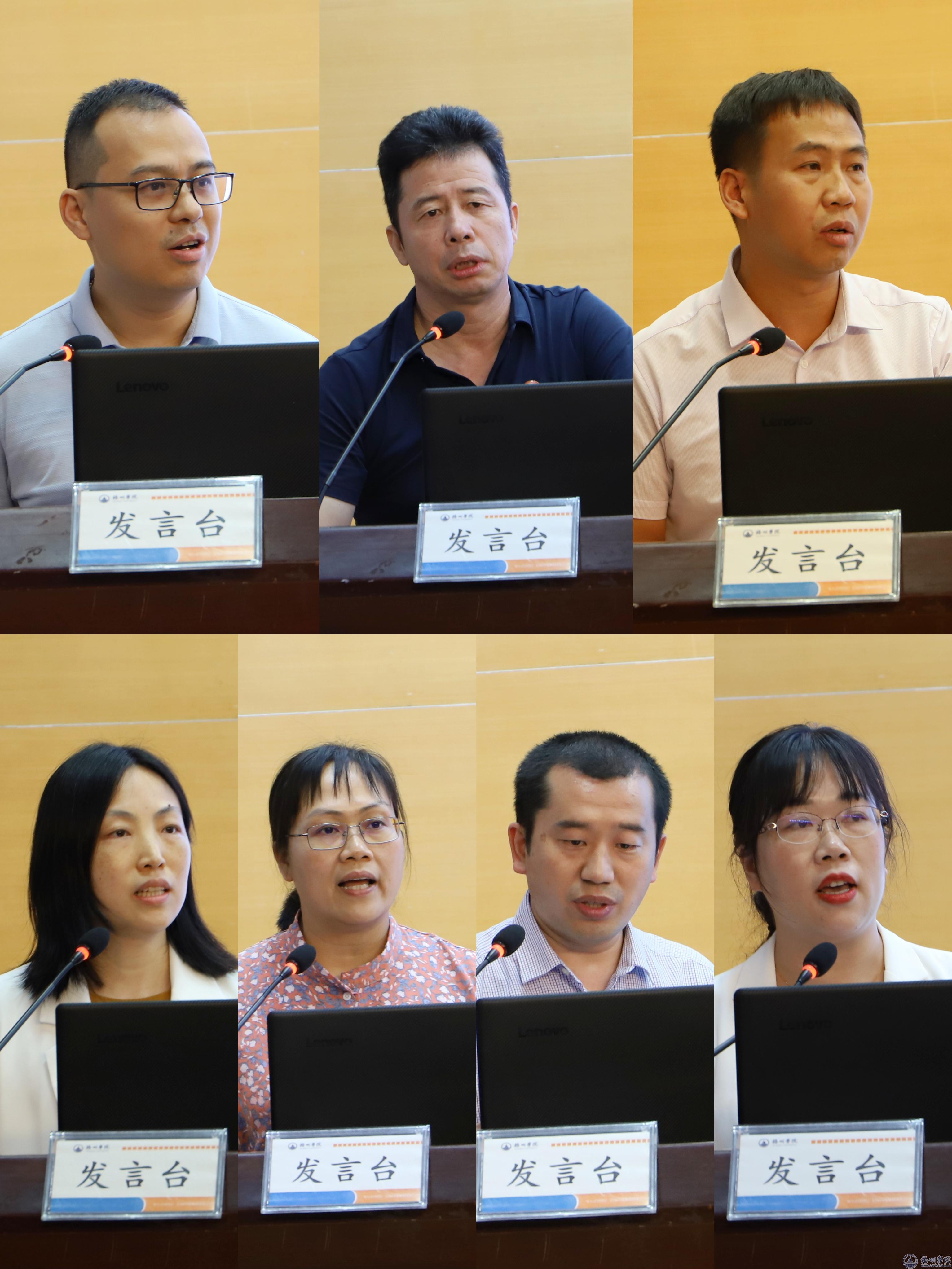 朱宇乾以“内外兼修 提高毕业生就业质量”为题,全面分析了2022年毕业生就业形势、存在的问题及解决对策;张立杰以“党建引领 助力申硕”为题,全面阐述推进清廉学校建设、推进党团品牌系列活动、提高毕业生就业质量等方面的情况;黄焕克以“党建引领,构建“三全育人”格局”为题,分享创建全区高校“三全育人”综合改革示范院系的经验和做法;廖壮欢以“立足职能,服务大局,为申硕攻坚做贡献”为题,从做什么、怎么做两个方面阐述发挥办公室职能,为申硕攻坚做贡献;陈丹以学校新闻宣传融媒体矩阵平台为例,全面阐述发挥宣传舆论作用,营造浓厚申硕氛围,助力学校高质量发展;彭金虎以“制度先行 让提高人才培养质量植根日常工作中”为题,全面阐述构建合理的教育教学体系,确保育人质量;许玉婷以“匠星筑梦 五育并举 助力学生全面发展”为题,以“匠星”品牌系列为例,全面阐述了做好学生思想政治政治教育工作,服务好学生全面发展成长成才。
