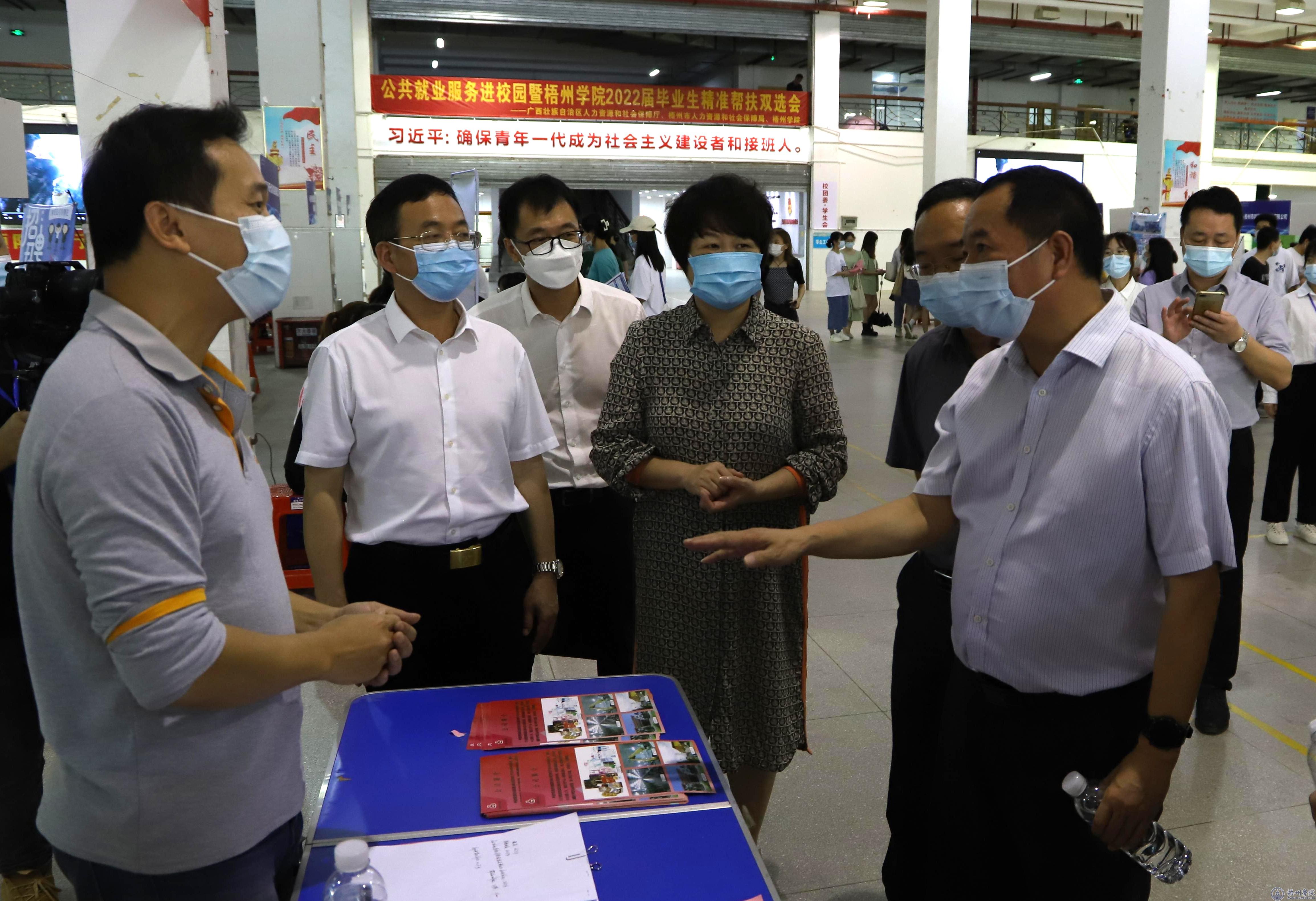 “今年来参加征兵的同学多吗?” “你们企业的招聘是现场面试吗?” “企业今年的效益如何?” “人才补助发放有多少?”调研组一行来到体育馆一楼,走进公共服务进校园暨梧州学院2022届毕业生精准帮扶双选会现场,每到一处,蒋劼详细询问招聘情况,与梧州市人社局和招聘企业工作人员详细交流。