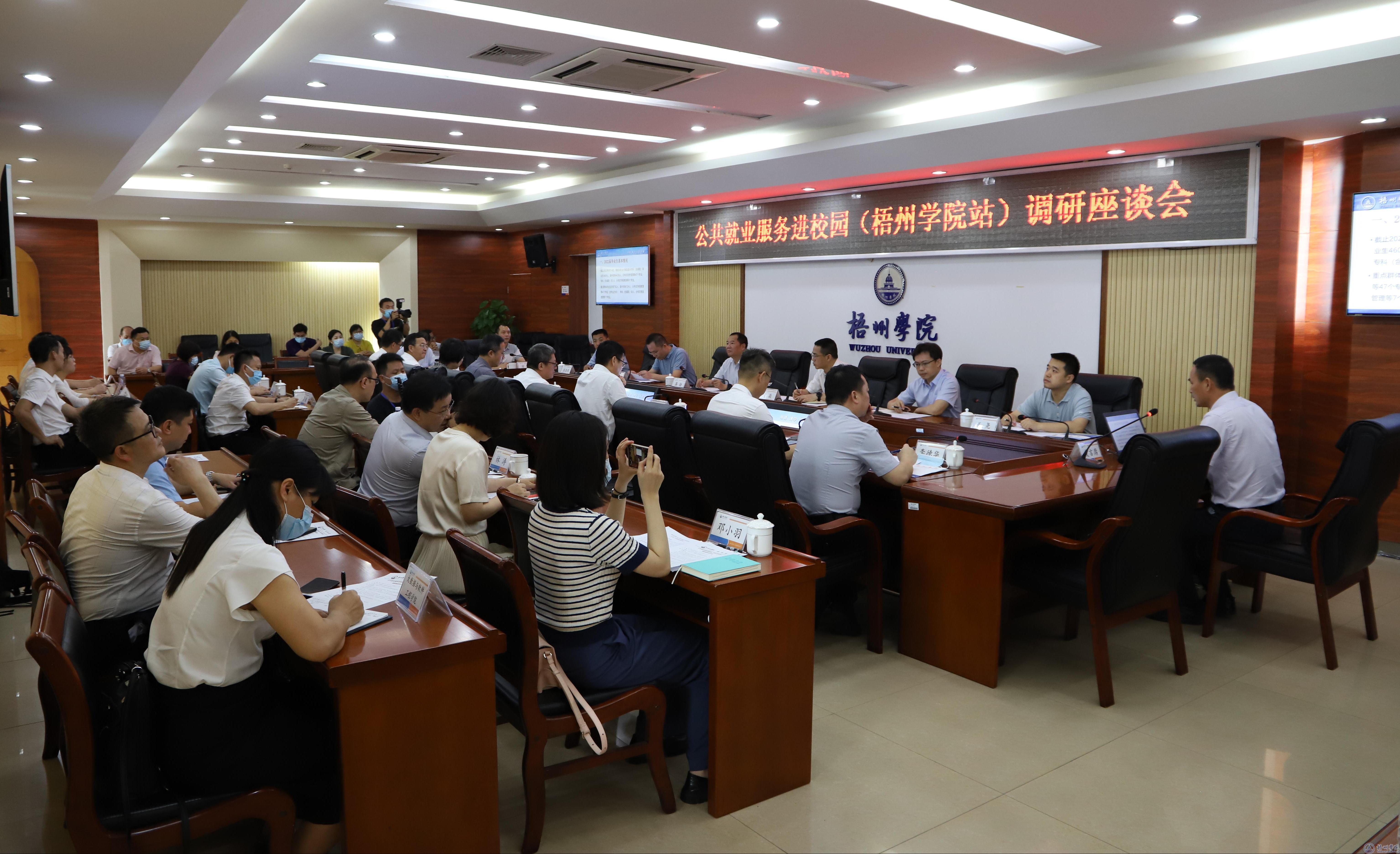 在明理楼第一会议室召开的公共就业服务进校园调研座谈会上,范生汝围绕就业工作进展情况、毕业生去向落实情况、落实责任目标、就业服务与指导情况、校领导访企拓岗促就业情况、举办访企拓岗专场双选会情况以及就业存在的主要问题和下一步工作措施八个方面作了汇报,宾月景介绍了学校高层次人才引进工作情况,人事处介绍了学校人事招聘工作进展情况。梧州职业学院院长陈森英、梧州市人社局局长秦晓宁分别作汇报,与会人员围绕招聘工作流程、人事管理工作等作深入交流。