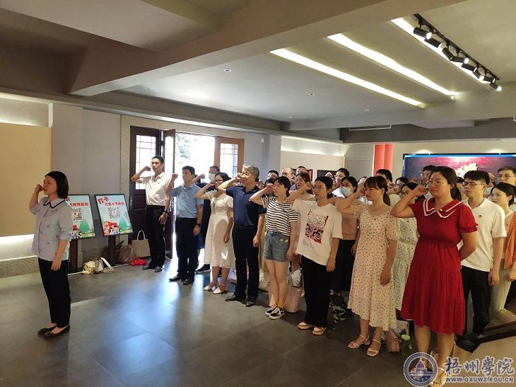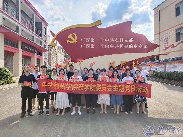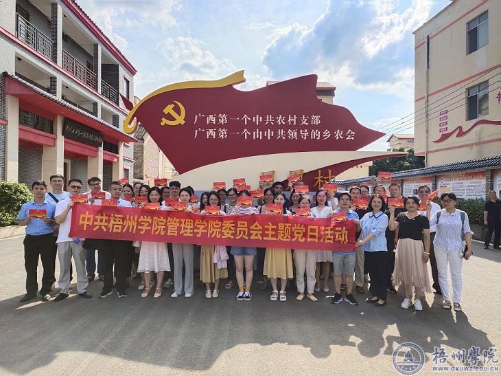 活动中,党员们来到梧州市万秀区夏郢镇凤凰村广西第一个农村党支部纪念馆,管理学院党委书记冀宁为党员们发放了政治生日贺卡,一起重温入党誓词。 商学院党委副书记叶子琛为党员们介绍了梧州市党组织发展史,让大家接受了一次深刻的党史教育。