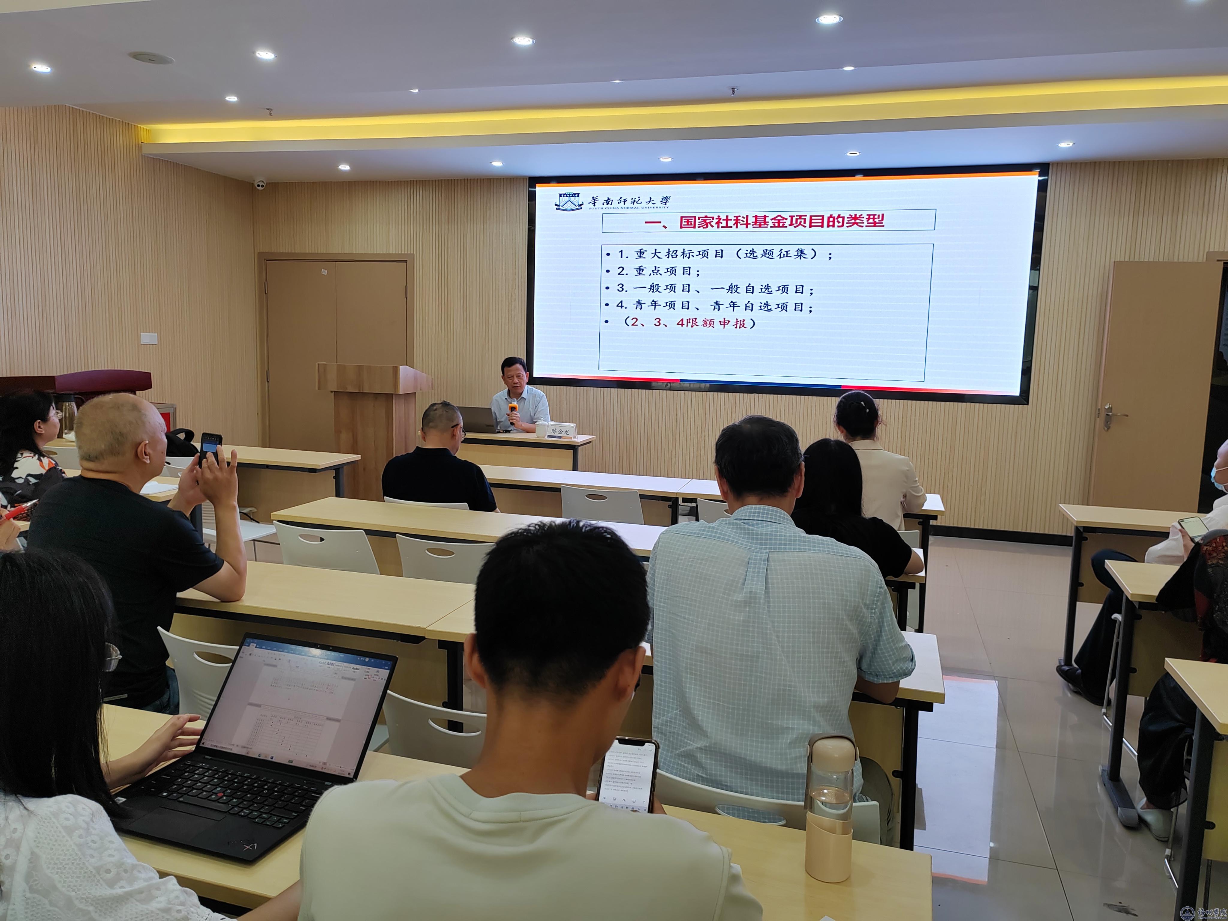 陈金龙教授从国家社科基金项目的类型、选题、论证、前期成果的准备及人文社会科学研究的体会等五个方面讲授,他表示申报国家社科基金项目时要找准选题方向,严格按照项目要求并注意细节写好项目申请书,要做到逻辑清晰、主题突出、层次分明、内容翔实、排版清晰,努力形成固定和有特色的研究方向、研究领域,打造自己的研究风格。