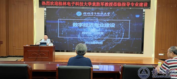 2022年9月,学校第一批录取数字经济专业的学生即将来校报到学习。为做好数字经济专业的建设工作,7月6日上午,受学校邀请,同济大学管理学博士、北京大学光华管理学院博士后、桂林电子科技大学商学院院长、兼任数字经济学院院长、博士生导师袁胜军教授在明科楼一楼报告厅作《数字经济专业建设》的专题讲座。会议由商学院副院长梁文光主持,商学院、管理学院主要负责人和教师60余人参加了会议。
